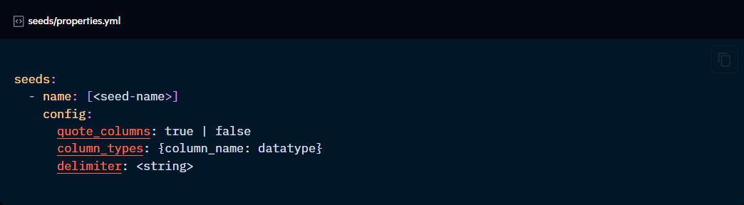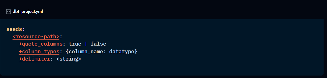 Seeds can be configured in the dbt_project.yml file, in a dedicated properties.yml file, or in the seed itself using the {{ config }} block.