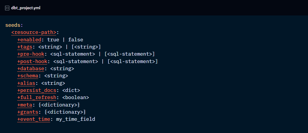 event_time: for seeds that track events, it defines the column where the time of the event lives for incremental materialisation, “--sample” flag, and CI/CD purposes.