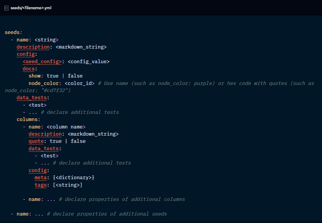 Definition, properties, and configurations for Seeds and the dbt seed command.