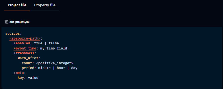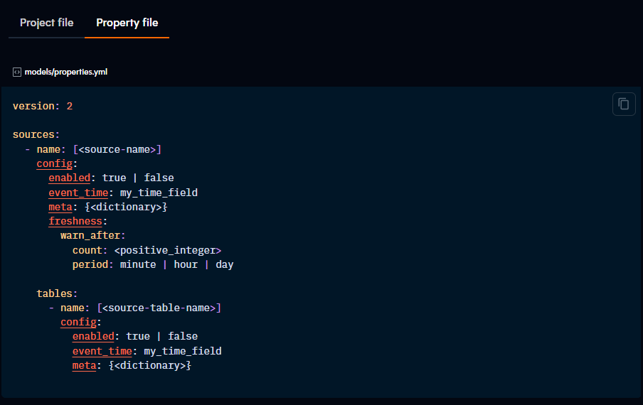 And here, we can see the config: property being used in a properties.yml file to control how sources and tables are treated: