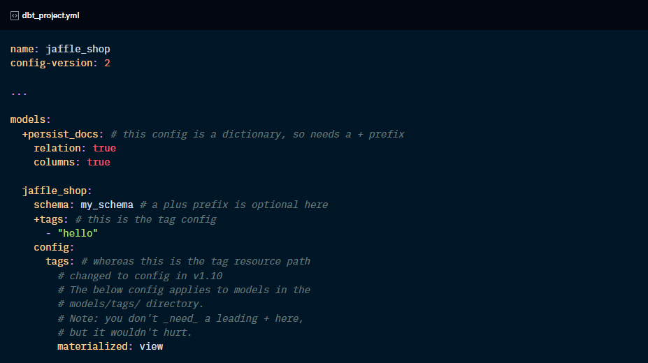 dbt differentiates between a configuration and a folder name by using a + prefix for configs. It also helps disambiguate folder names that have the same name as configs (like a folder called “tags”).