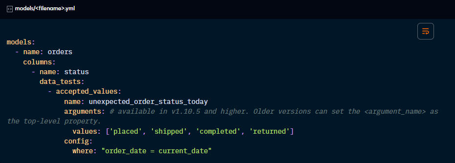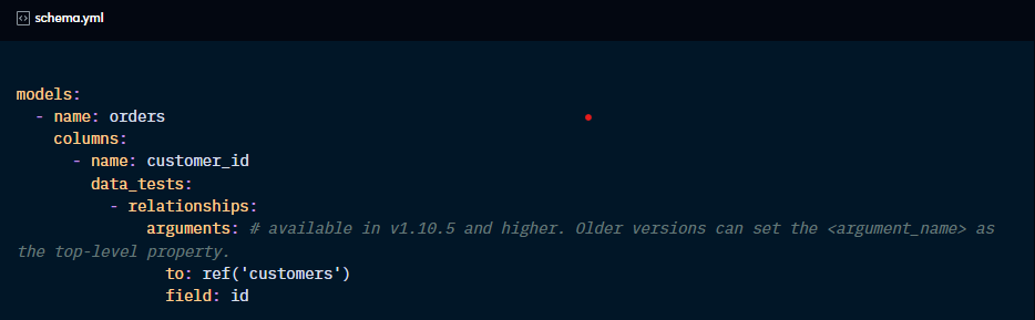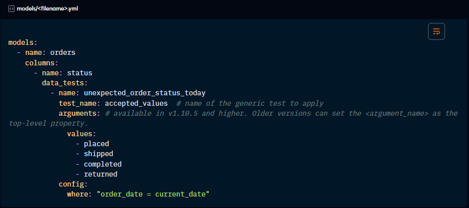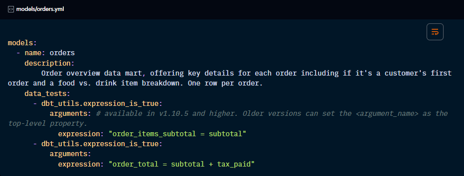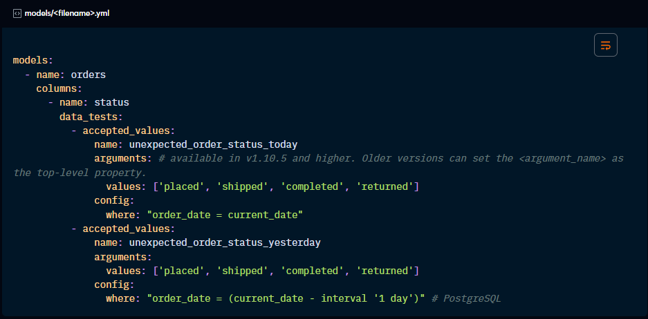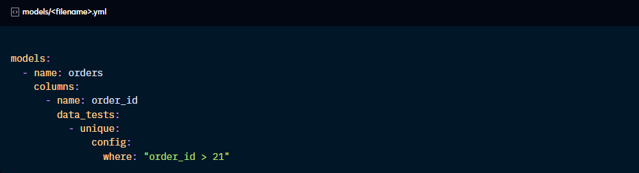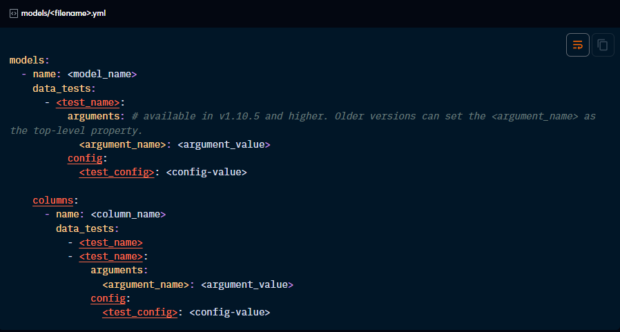 When a data test involves multiple columns, it doesn’t make sense to place it under the “columns” key. In these cases, you apply the test to the model.