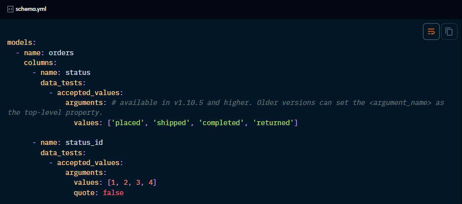 dbt offers the option to define test properties using the “test_name” property to make your file easier to read. The result is the same.