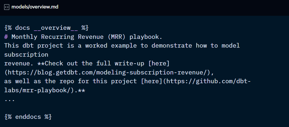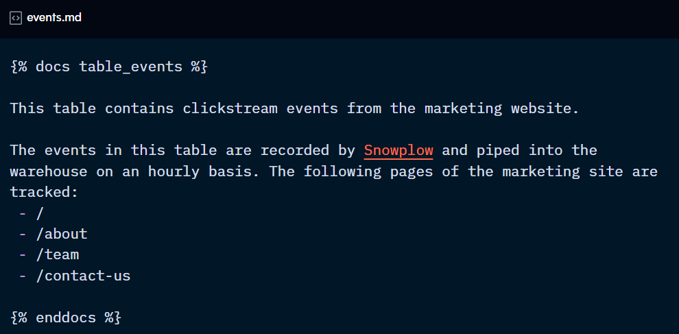 Docs block files need to be uniquely named and use the “docs” Jinja tag. Their name can contain alphanumeric digits and underscores, but it cannot start with a number. The file type is .md.