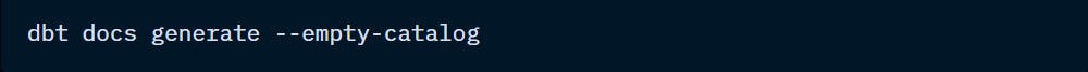The “--empty-catalog” does not populate the catalog.json, which can speed up the command in development. However, in production, you can end up excluding valuable warehouse information from the docs, like column types, stats, sample values, etc.