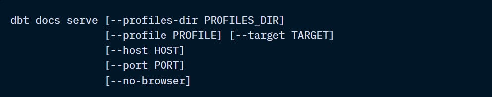 After generating documentation with “dbt docs generate”, this command starts a web server on port 8080 to serve your documentation locally and launches it using the default browser.