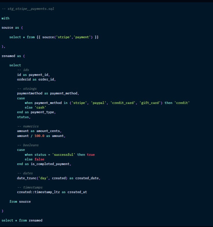 Also, the author clarifies that although we are following the order of the DAG here, that is not how you would design your project. In a real-life scenario, you would first align with stakeholders on what the output should be. Then, you would identify the tables and the logic necessary, and build the SQL to achieve it. Then, you would break the SQL up into layers.
