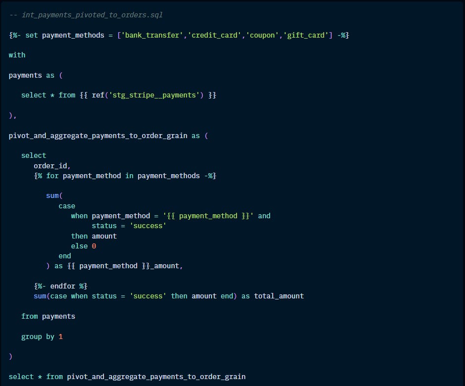 Examples: join stg models to generate a mart, re-aggregations (like number of orders per payment method), isolating complex operations (like pivotting or unpivotting)