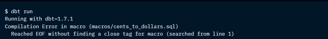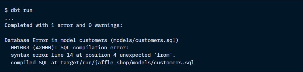At parsing, dbt checks that the Jinja snippets in the .sql files are valid and that the .yml files are valid. If you’re using the IDE, the error often shows as a red bar in the command prompt. For dbt Core, they won’t get picked up until you run “dbt run” or “dbt compile”.