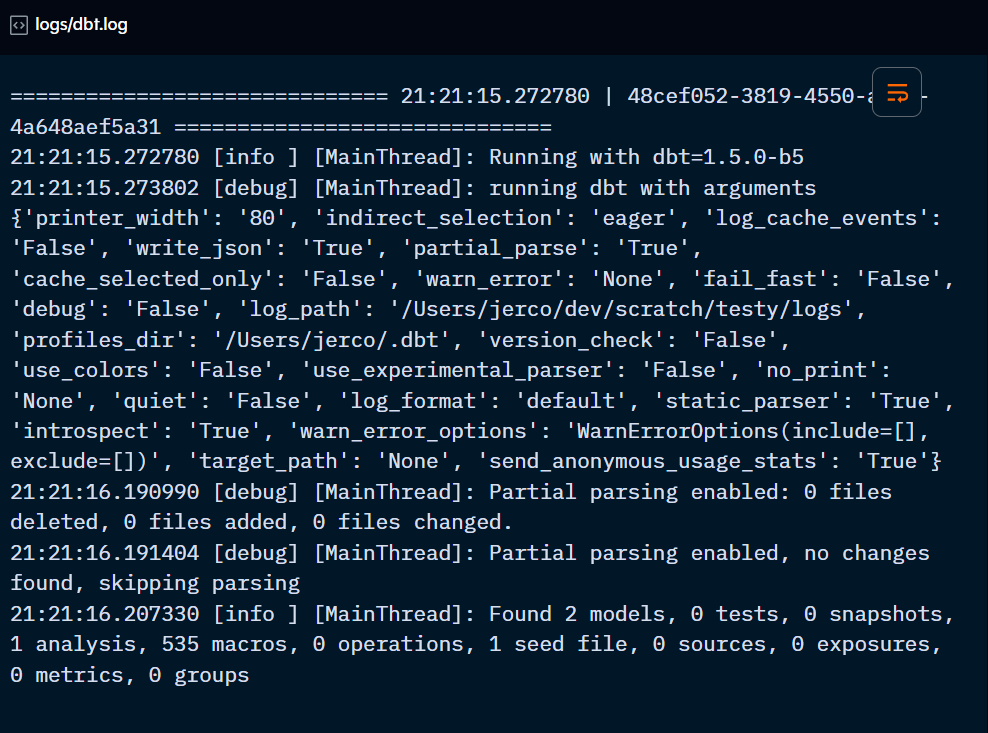 As dbt runs, log messages are generated with the events that took place. These logs are written into two places: at the command line terminal (stdout) and in a debug log file (logs/dbt.log).