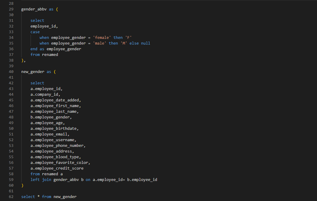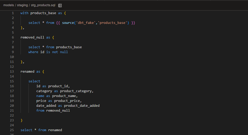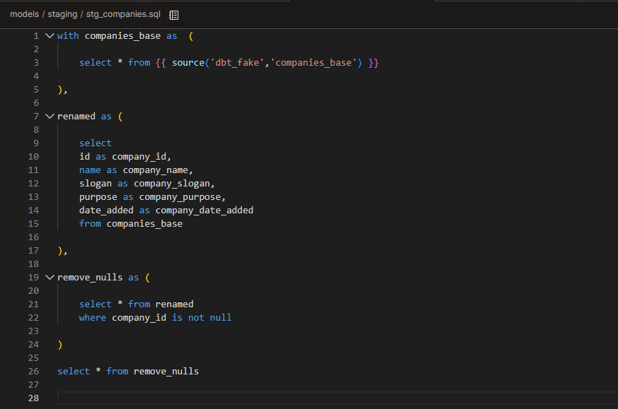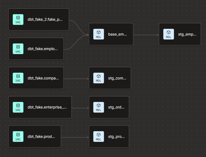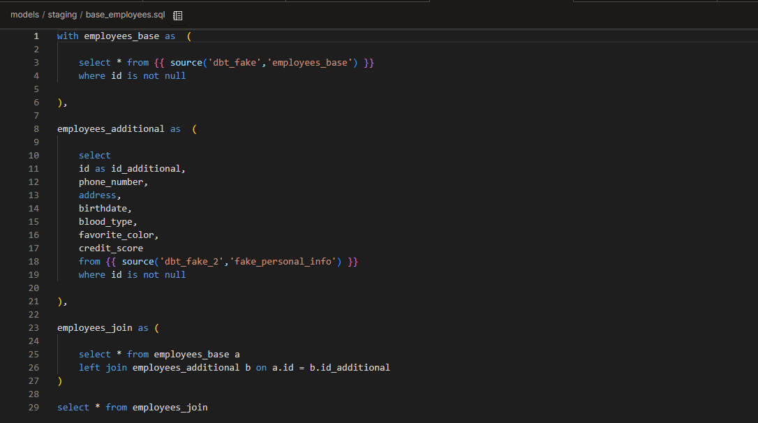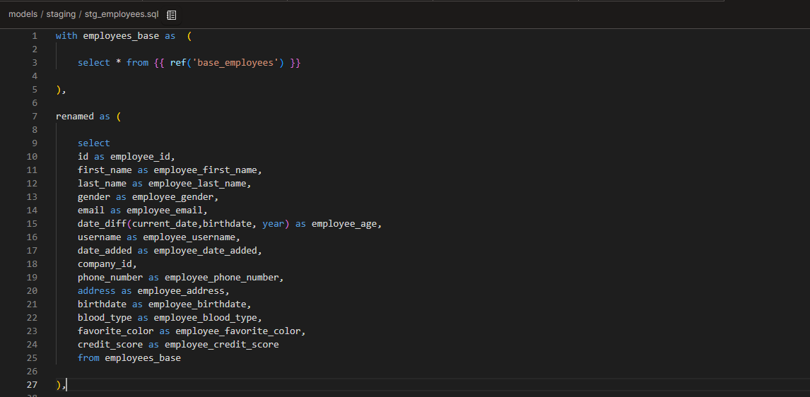 In this study note, we learned that the staging layer should be reserved for basic cleaning operations like renaming columns, type casting, removing nulls, etc. You will also notice that for the employees table, I had to create a base model to join two sources.