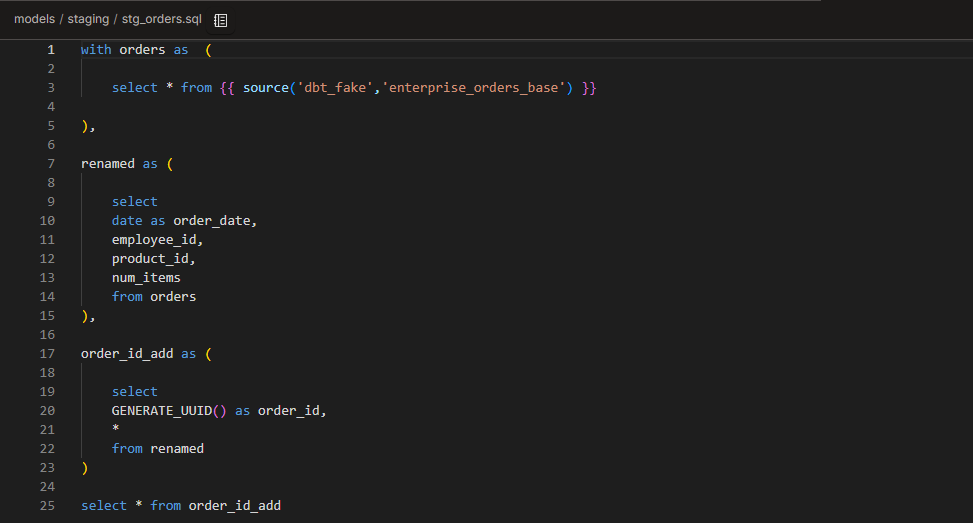 Added order_id. For now, I am using generate_uuid, but when we introduce packages, I will create a surrogate key with dbt utils.