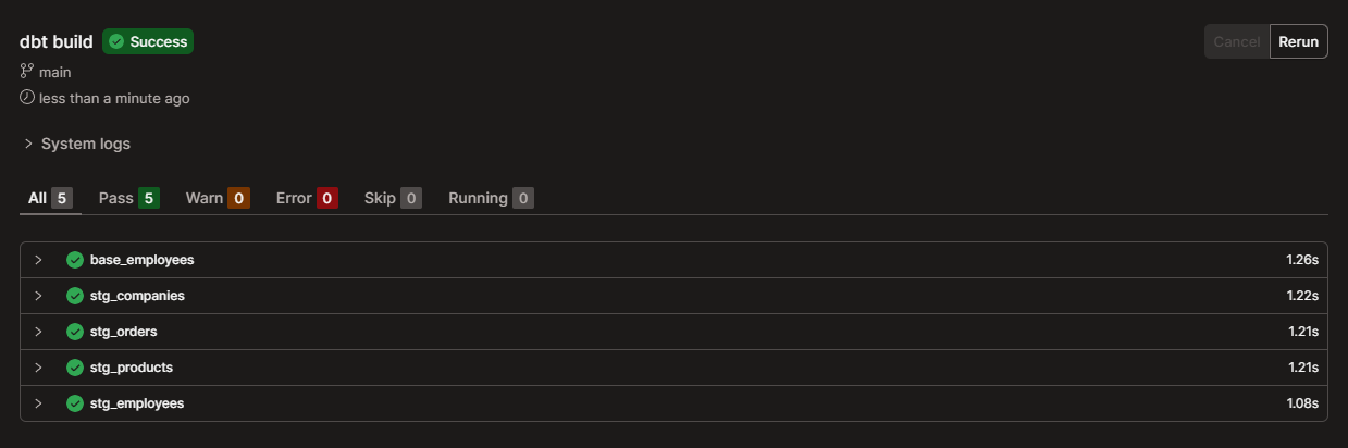 Now, we can build our models using the “dbt build” command. You can also run the command “dbt build --select stg_*” to run only the staging models, if you consider the base model for employees to be unnecessary.