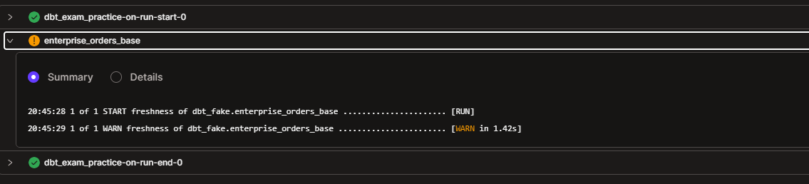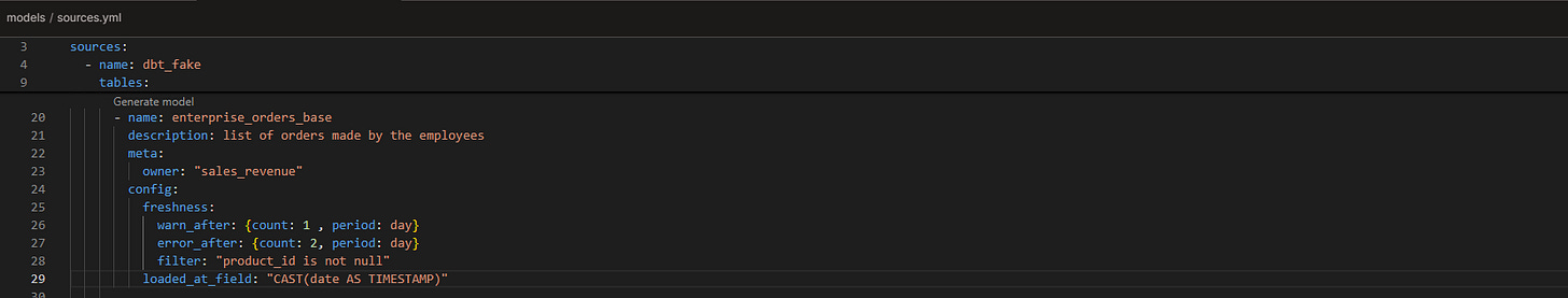 Configs: meta, freshness: declare it and test the source freshness command. Change the warn_after/error_after so you get stale and fresh results for practice. In my case, I set up freshness for the enterprise_orders_base source and tested it using the “dbt source freshness -s "source:dbt_fake.enterprise_orders_base"“ command.