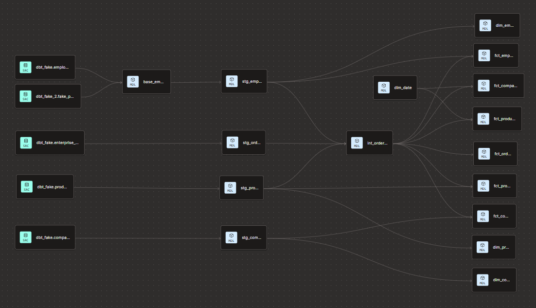 fct_orders: this is just a select from the int_order_detail model. We repeat it here because the int model is being referenced by other marts models and, according to the best practices, marts shouldn’t refer to marts. It’s an extra model, but it helps keep things organised.