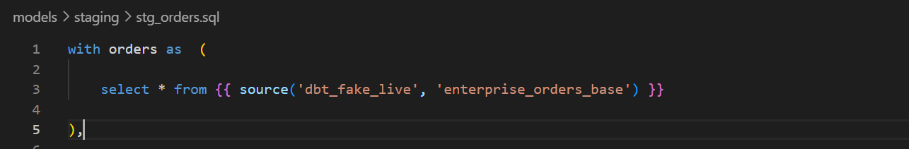 Also, when we use the source function, we are declaring the source namespace. In the example below, it would be “dbt_fake_live”.