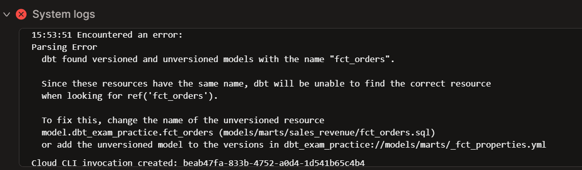 Upon trying to compile the v1 (dbt compile -s fct_orders:v1), dbt seemed to see two “fct_orders” models, one versioned and one unversioned.