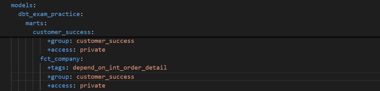 First, we need to define a group. We already have some groups defined by department, like the “customer_success” group, which holds the “fct_company” and “fct_company_trend” models.