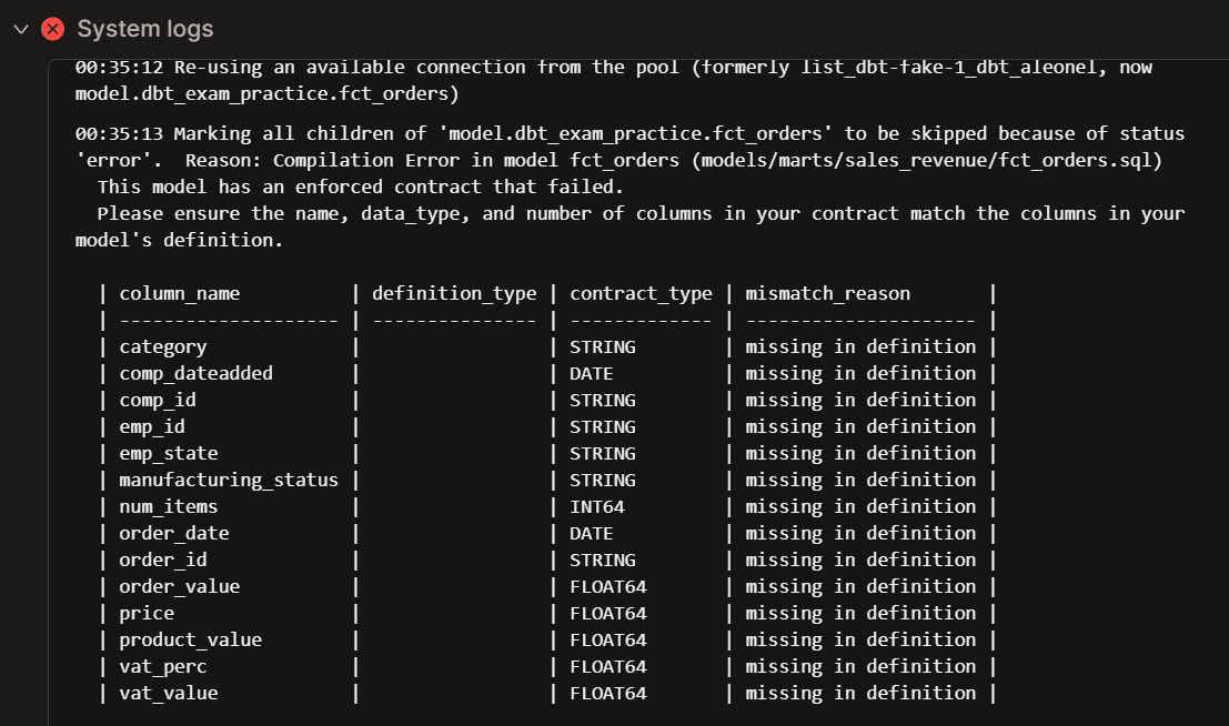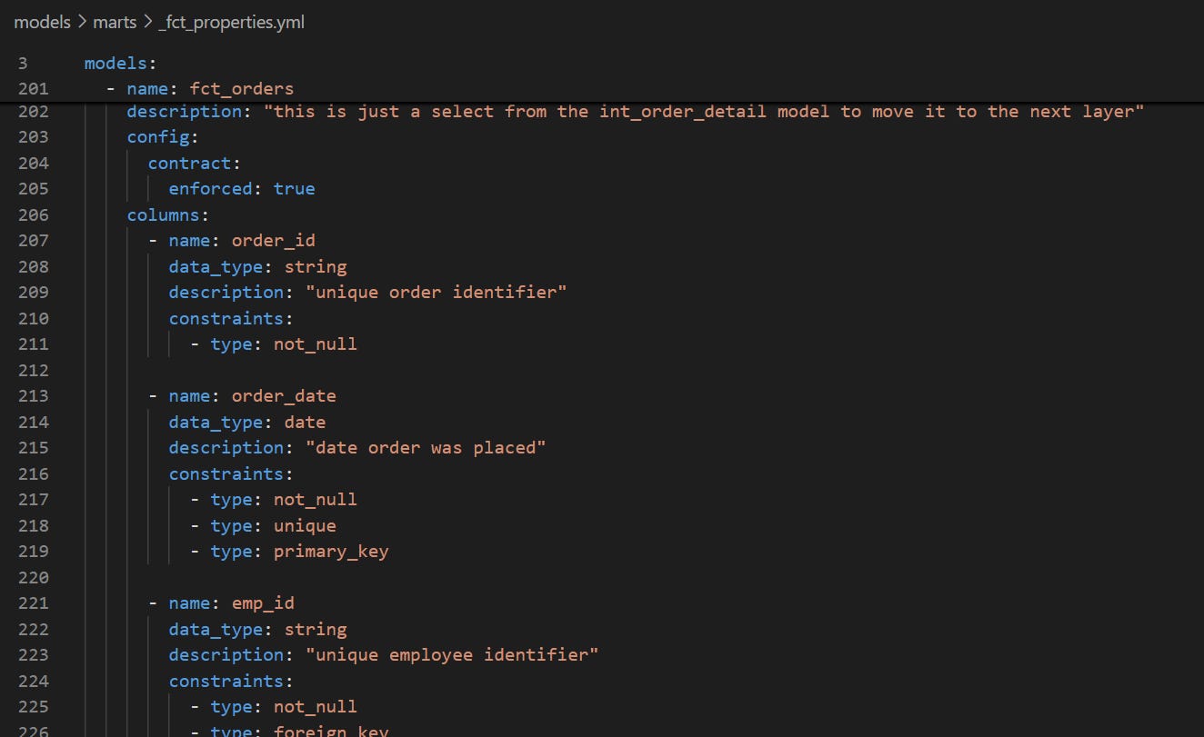 Following dbt’s recommendation, we will enforce some contracts in our fact tables. For instance, fct_orders could use some contracts, as we started feeding it with live data in the Practice Project 4 - Step 2.