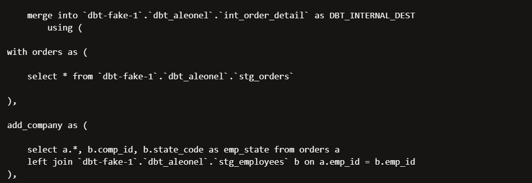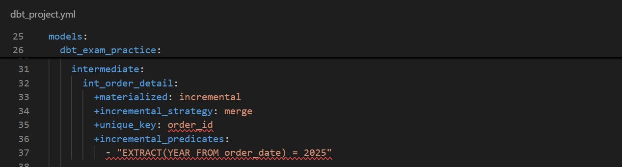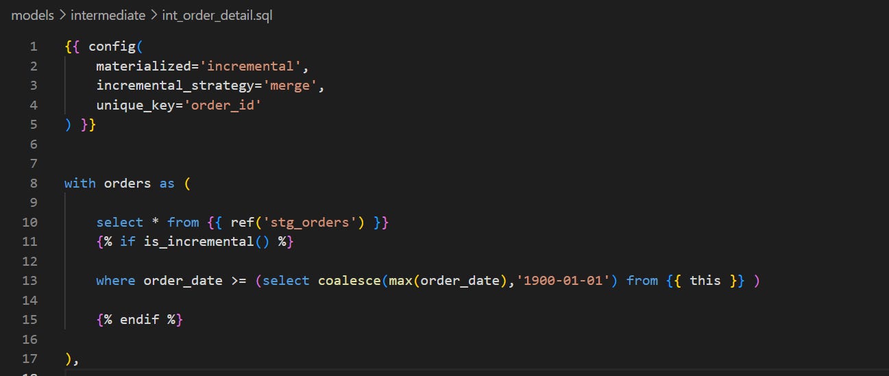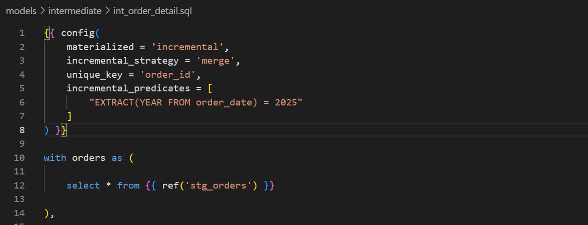 In our case, the optimal model is int_orders_detail. We are also going to implement a merge strategy and limit the scan of new records to orders from 2025. We are taking the assumption that orders from previous years never change.