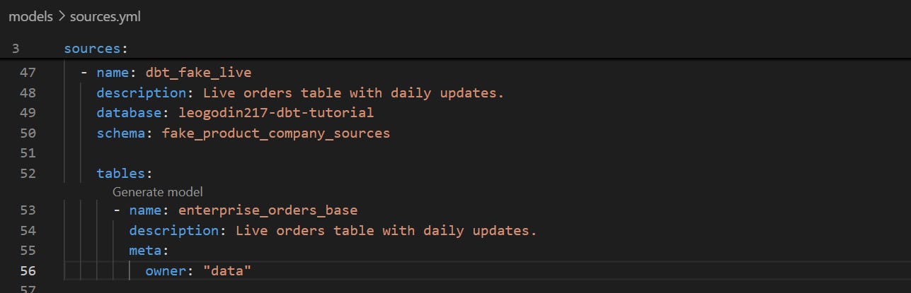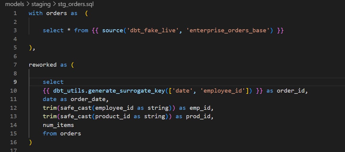 Now, we are going to replace the orders source in the “stg_orders” model. Optionally, you can also remove the static orders table from the source.yml file or use the “enable: false” property to remove it from the project.
