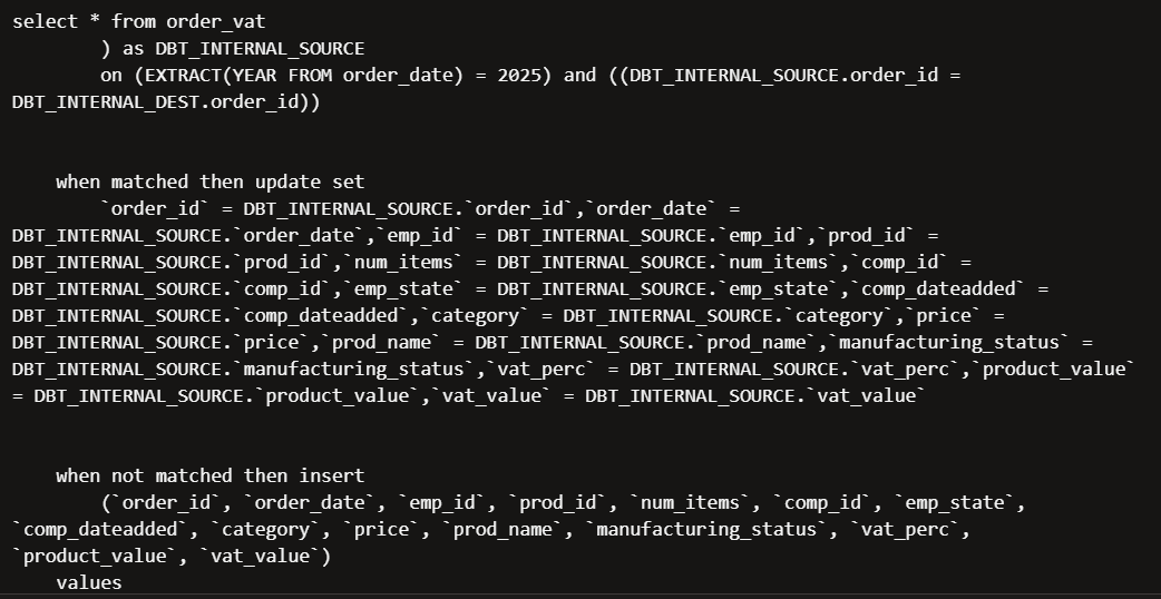 The logs are even more detailed in this case. You can see dbt tried to merge the new records, applied our predicates, and only searched for new records within orders from 2025.