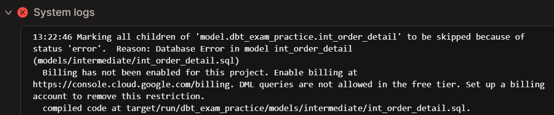Upon trying to build the models, the command fails and the logs show that dbt tried to run a DML query, but my adapter has billing disabled.