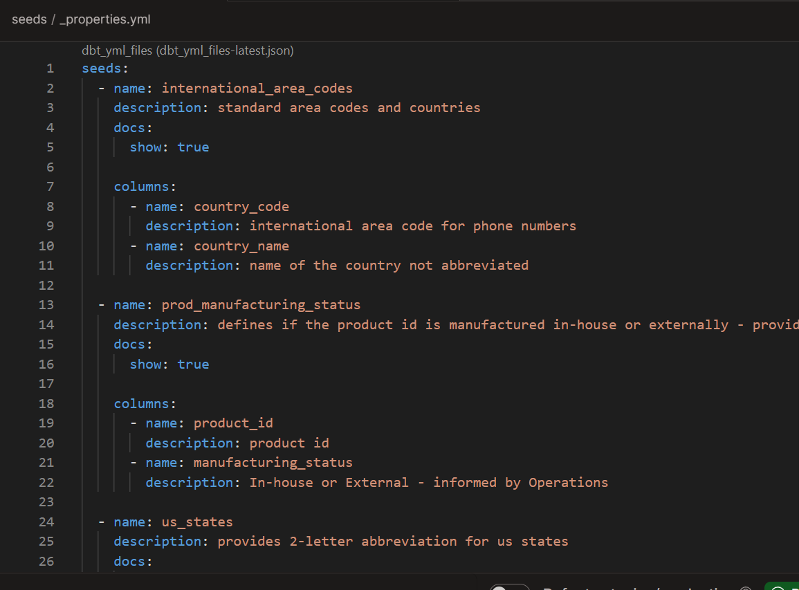 You can also define configurations in dbt_project.yml for your seeds. In this case, I did not need quoting, set a different delimiter, or change data types, so I did not configure them in the project file to reduce clutter.