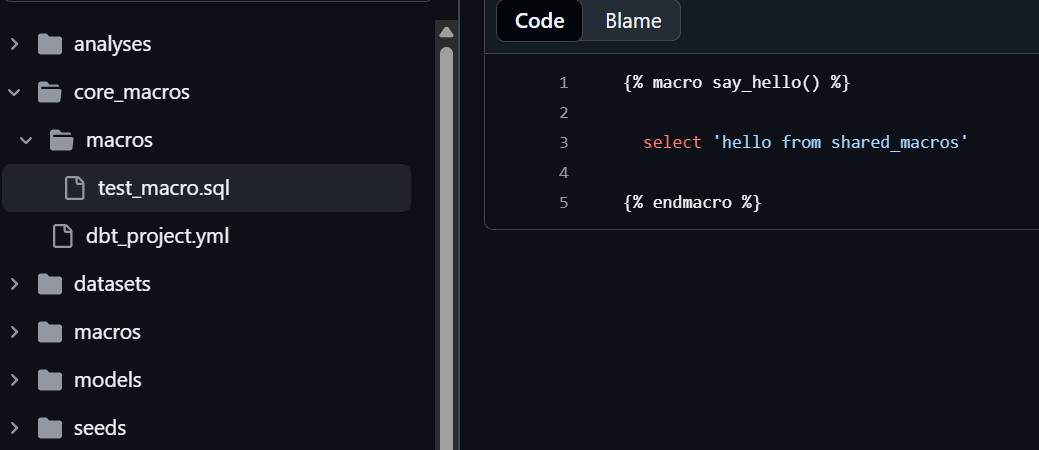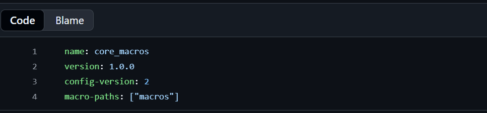 In my project’s repo, I created a core_macros folder, which essentially acts as an external project I will add to my main project. Thus, it requires its own dbt_project.yml file and, of course, the macro we will be using.