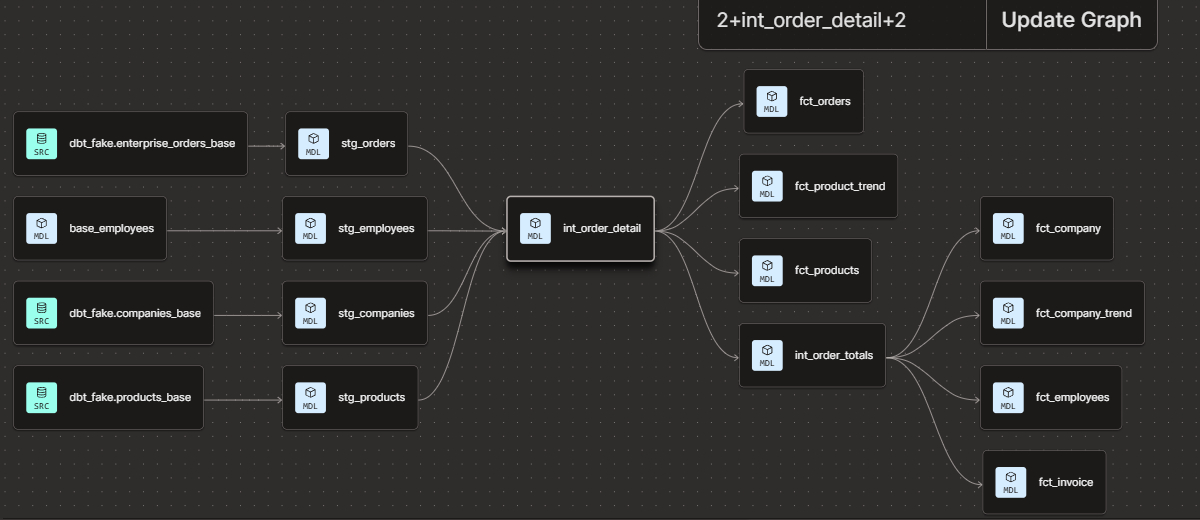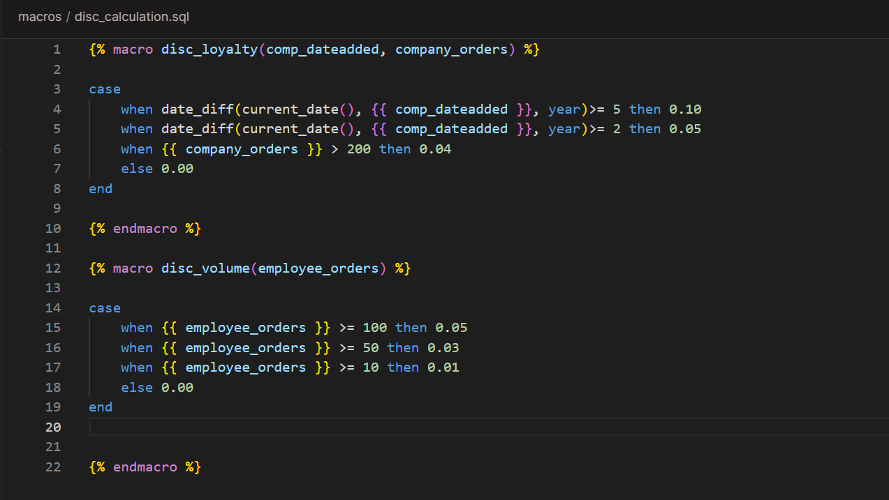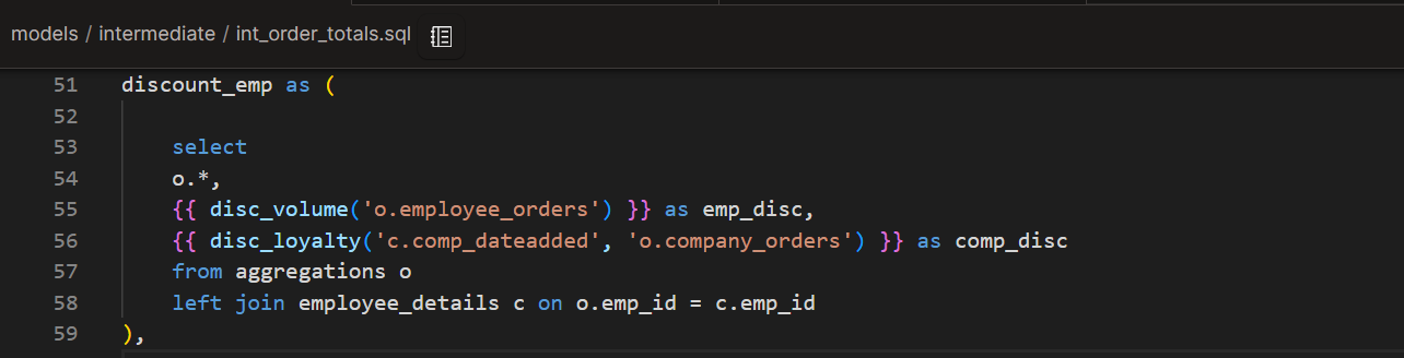 When we created the intermediate models for the orders, we added some case whens to define the level of discount based of time since joined as well as volume of orders. We also had a VAT that would vary according to the product category.