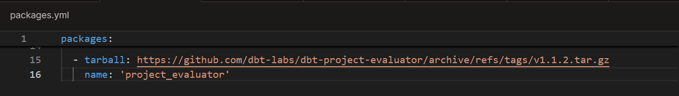 We will use the package project_evaluator available on dbt Hub, but we will install it using the tar.gz link: https://github.com/dbt-labs/dbt-project-evaluator/archive/refs/tags/v1.1.2.tar.gz