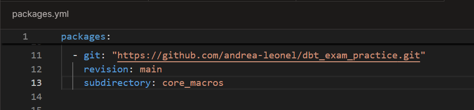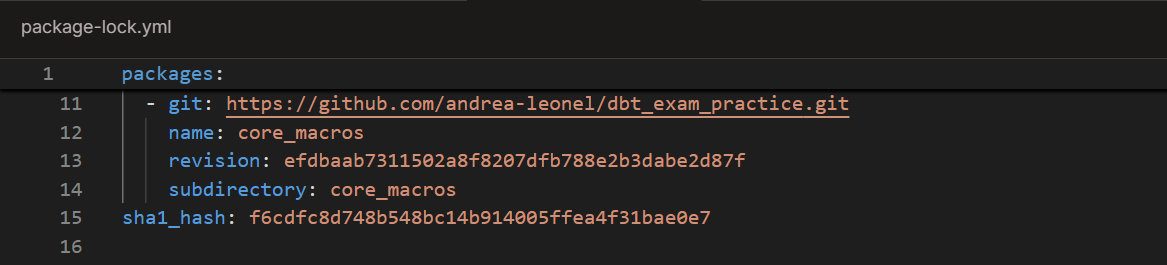 One thing to note is that dbt will pin this package to a specific commit in package_lock.yml. Which means that if you make changes to the macro in a new commit, you need to edit this information in the package_lock file: